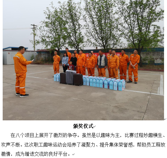 2019职工趣味运动会 为进一步增强职工们的身体素质,丰富文体生活,增强凝聚力,在“五四”青年节来临之际兖州文水分公司、吕梁分公司、中材文水分公司精心筹备,周密策划的职工趣味运动会,在兖州文水分公司生活区如期举行。本次运动会的主题是“以促进友谊为主,贵在人人参与,活跃公司气氛”。以青年员工为主20多名干部职工参加了本次运动会。通过自娱自乐这种形式,增强团队合作精神,培养职工热爱运动,促进身体健康,增强公司凝聚力、战斗力、号召力的目的。5月6日下午,三个分公司的职工趣味运动会,在经理王建立宣读比赛规则后拉开了帷幕。此次活动由办公室人员组织策划,得到公司大力支持与全体员工的积极配合和参与。本次运动会共设有八个比赛项目: