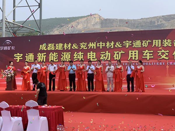 2021年7月17日,成磊建材&兖州中材&宇通矿卡三家企业代表在成磊建材矿区举行隆重的交接仪式,标志着兖州中材建设有限公司矿山开采在践行“绿水青山就是金山银山”的发展理念中迈出坚实一步。 出席本次交接仪式的有:禹州市成磊建材有限公司张景奇总经理及宋朝阳常务副总经理,兖州中材建设有限公司颜景祥副总经理及兖州中材河南省内各项目尚晓峰、宋道明、沈磊、刘国荣及陈茂兴经理,宇通矿用装备销售公司马勇总经理及宇通华北分公司刘宝柱总经理,以及禹州市成磊建材有限公司、兖州中材建设有限公司职工代表。 仪式现场彩旗飘飘,人声鼎沸,场面气氛热烈而隆重。首先,宇通矿用装备销售公司总经理马勇先生致词,马总介绍了宇通客车响应国家政策在新能源矿车领域拥有的先进技术和取得的市场成就,以及对兖州中材建设有限公司、禹州市成磊建材有限公司美好明天的祝福。随后,兖州中材建设有限公司副总经理颜景祥先生上台致词,颜总强调,兖州中材建设有限公司作为中央企业是更具有社会责任感的企业,兖州中材在谋求发展的同时积极贯彻国家政策,在矿山施工中率先使用新能源设备,为构建“资源节约型、环境友好型”社会做出应有的贡献,承担央企责任,担负央企职责。最后,禹州市成磊建材有限公司总经理张景奇先生致词,张总肯定了兖州中材建设有限公司在矿山施工中采用更加安全环保新型设备的工作,期望兖州中材建设有限公司依靠过硬的施工技艺、新型的生产设备、高效的管理模式将禹州市成磊建材有限公司矿山在全省乃至全国范围内树立标杆,打造成示范性矿山。 致词完毕,仪式进入剪彩环节,由禹州市成磊建材有限公司张景奇总经理、宋朝阳常务副总经理,兖州中材建设有限公司颜景祥副总经理、禹州第四分公司尚晓峰经理,宇通矿用装备销售公司马勇总经理、宇通华北分公司刘宝柱总经理共同上台剪彩,随后,由刘宝柱先生代表宇通公司向兖州中材建设有限公司颜景祥副总经理交付金钥匙,并对前来参加仪式的一对舞狮进行点睛,寓意“点石(狮)成金”。 伴随着台上舞狮的激情表演以及空中飘舞的礼花,成磊建材&兖州中材&宇通矿卡交接仪式圆满结束。