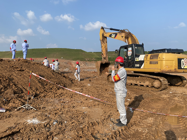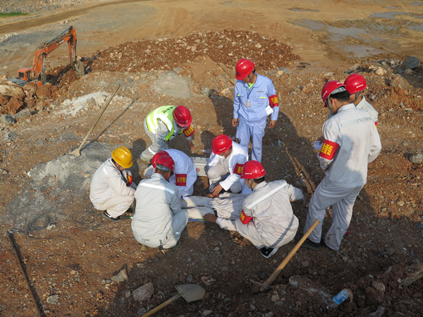 演练模拟矿山施工作业面35平台进行爆破作业,由于炮孔充填深度不够,导致冲孔现象,产生飞石,现场管理人员在矿区北侧警戒时,被爆破飞石砸中,导致腿部受伤,伤势严重。总指挥在接到救援电话后,立即启动三级应急预案,通知办公室、各应急小组就位。矿山应急救援队员携带专业救援装备,驾驶应急救援车,拉警报,火速赶赴事故现场。到达现场后,立即判断受伤人员伤情,及时救出并进行止血包扎、固定等简单处理后由救援队员用担架抬上120救护车,并送往就近医院救治。演练过程中各应急小组各司其职、协同作战、反应迅速,整个演练过程在快速、紧张、有序的氛围中进行,圆满完成了各项预定任务。    此次放炮应急预案演练贴近实战、分工明确、行动迅速、救援工作有条不紊地执行。既督促企业落实安全主体责任,指导提高员工的安全隐患意识和管理能力,确保了黄槽坊矿山的整体安全,又达到了检验矿山应急救援小组的实战和应对突发事件的应急处置能力的目的,更进一步检验了预案的可操作性和针对性,为今后突发生产安全事故下熟练完成救援任务打下了坚实的实战基础。