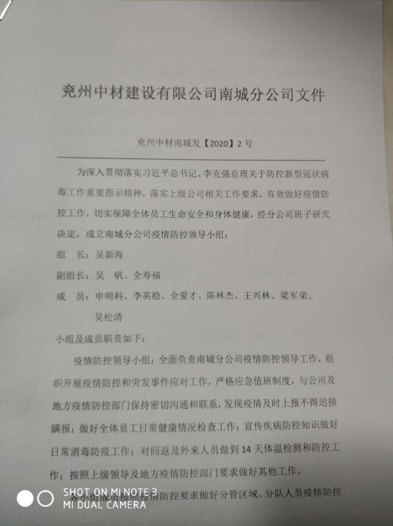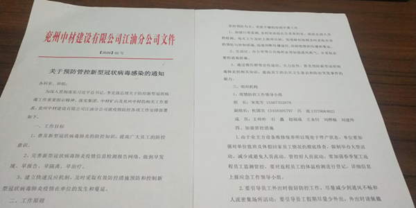 春节期间,一场突如其来的新冠病毒肺炎席卷全国,疫情防控形势严峻。疫情就是命令,按照上级党委要求,做出部署和安排,兖州中材第一时间成立由总经理任组长的疫情防控领导小组,及时制定和启动应急预案,各分公司和项目部按照疫情成立了疫情防控组织机构,成立了疫情防控青年突击队,对所属分公司积极推出疫情防控制度与措施,认真宣传,抓好落实,严防死守,阻断疫情传播,切实做好疫情防控和复工复产等各项工作,切实保障员工生命安全和身体健康。针对当前疫情情况,分公司具体通过以下措施确保安全复工复产: 一、分公司成立疫情防控领导小组,制定复工复产方案,分公司经理任组长,领导小组按照当地政府与公司要求,严格落实疫情期间的消杀管控及登记制度,并与当地政府、业主加强沟通,将感染风险降至最低。