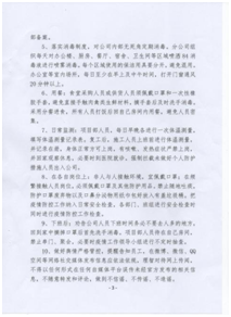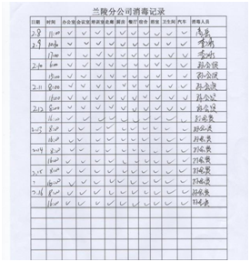配合当地政府体温监测 落实措施,扎实开展防控工作。分公司设立疫情防控点,配备防护口罩、手套、防护镜、体温计及测温枪、酒精、84消毒液、喷雾器等防护物资。严格控制返程人员,对居住或经过疫情防控重点区域人员,要求暂不返回项目部,居家隔离自我观察;要求返回项目部人员,返程路上严格落实个人防控措施,制定记录表,对返回人员严格检查、登记;返回项目部后,在项目部内自行隔离14天,每天早晚测量体温并做好记录。    返程人员登记 每日体温监测 集中开展项目部卫生消毒工作。分公司通过多种渠道,购进酒精、84消毒液等药品,每天上午下午各进行一次集中消毒工作,办公室、会议室、厨房、餐厅、宿舍、卫生间、走廊、院内边边角角,全面消杀。  项目部消毒 消毒记录