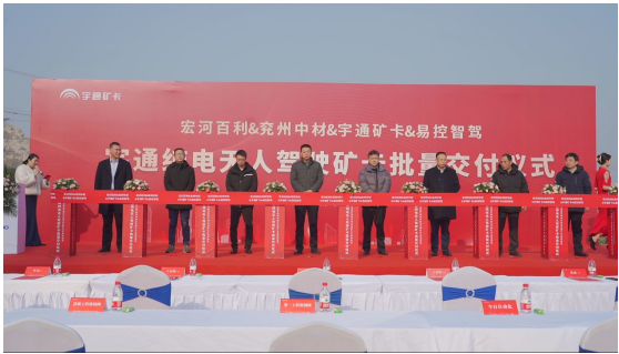 2022年12月28日,宏河百利、兖州中材、宇通矿卡、易控智驾四家企业代表在兖州中材邹城分公司隆重举行了纯电无人驾驶矿卡批量交付仪式。