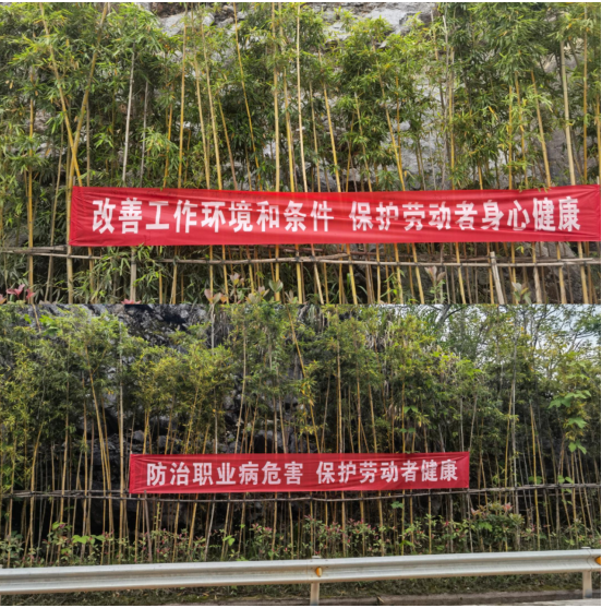 为使宣传活动更深入人心,在矿山道路两旁悬挂宣传横幅,时刻提醒各岗位职工的健康防护意识。