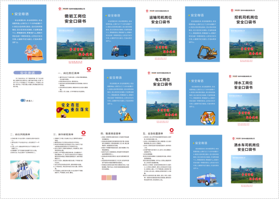 口袋书封面背页以安全为主题,与生产相结合,内容包括安全文化标语、口号、个人安全承诺、具体岗位职责要求、风险辨识、操作规范、隐患排查、应急处置等。