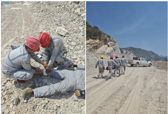 此次演练是模拟爆破后,爆破作业人员进入爆破作业区域确定是否有无盲炮,由于爆破震动产生岩体松动,爆破作业人员躲闪不及被落石砸伤,导致无法起身。事故发生后,分公司立即上报并启动放炮事故应急预案,循序开展救援。
