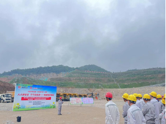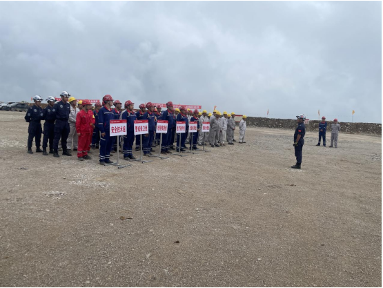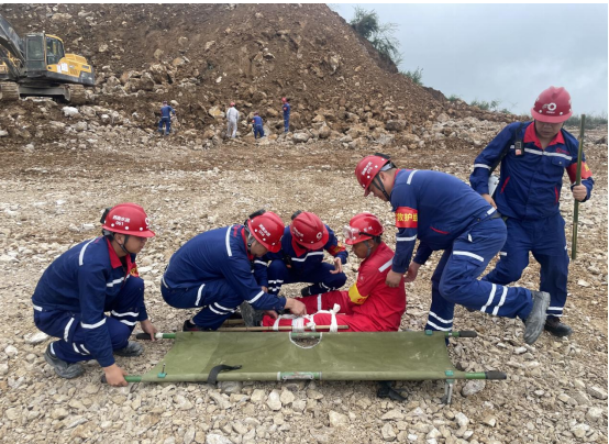 演练现场模拟遇强降雨后边坡发生垮塌事故,在接到险情报告后,应急指挥部立即启动应急预案,组织各救援小组赶赴现场