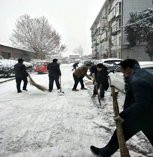 --记一次别具一格的党课 2019年元旦刚刚度过,一场不期而遇的大雪造访了嵫阳故郡,银装素裹,分外惊艳。 然而大雪的降临也给大家的出行带来诸多不便,公司基地大门口、办公楼前、生活区的道路都被皑皑白雪覆盖,尤其是给老人和孩子的出行带来的不便尤甚。上午上班时间还不到,兖州机关党支部书记李增光第一个拿起了扫帚,来到办公楼前扫起了雪,行动就是无声的号召,公司机关的干部职工都不约而同的拿起扫帚铁锨,加入到扫雪的大军。铁锨和地面的碰击声、扫帚清扫雪花的刷刷声,不一会儿办公楼前的积雪已踪影全无,然而大家并没有停住脚步,继续向大院深处走去,球场、院门、居民楼前......所到之处,雪没了,路干净了,路过的人们纷纷投来赞许的目光,挂满枝头的冰凌随风婆娑起舞,似乎也在点头称赞,大家的心中更是无比的欣慰,虽然脸红了、出汗了,但累并快乐着。  积雪清除了,之后诚如公司党委副书记何芳训与工会副主席刘衍胜在公司党员微信群中的互动,何书记的点赞、刘衍胜的“为人民服务”,更是生动而又形象的诠释了兖州中材广大党员干部职工的精神面貌,这不仅是一次义务劳动,还是一场别具一格的党课。 习近平总书记在2019新年贺词中这样说道:“前行中我们风雨兼程,不断跨越艰难险阻,迈向远方......再回首,已是万水千山,2019改革开放再出发,我们鼓足干劲,不停步,向着梦想的彼岸奋勇前行”。2019年的第一场雪,瑞雪兆丰年,新的一年,新的征程,相信在以柯升总经理为首的公司领导班子正确带领下,也定是兖州中材人更大丰收的一年!